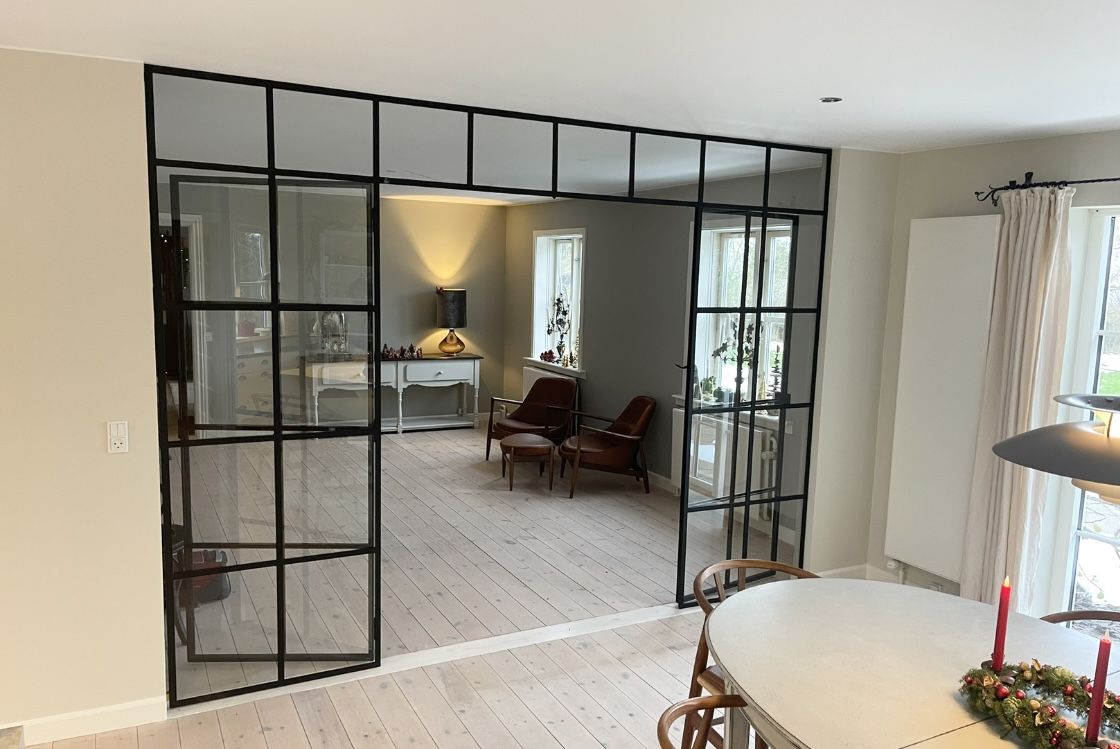 Stor skillevæg i glas med jernsprosser fremstillet i New Yorker-stilStor skillevæg i glas med jernsprosser fremstillet i New Yorker-stil
